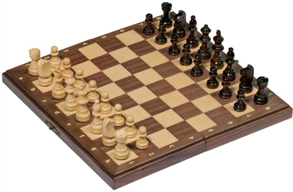 Very nice wooden chess set in a foldable box. The pieces can be stored in the set when it's folded. Natural and Stained Brown This chess set has a very good size and can serve as a high-quality large travel set or for a trip to a cafe where there isn't much space on the table.