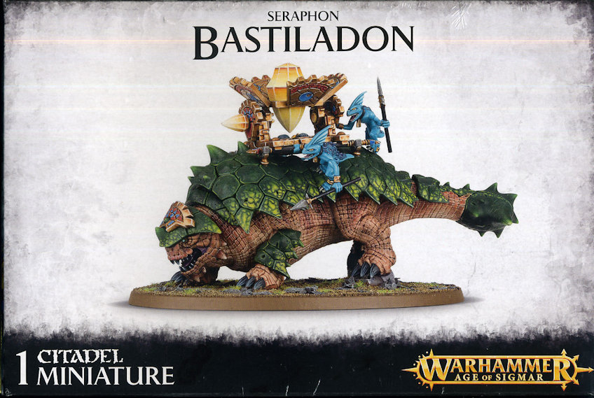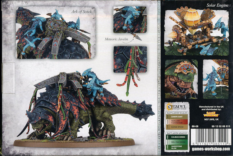This multi-part plastic kit contains all the components necessary to assemble one Bastiladon. This kit can be optionally assembled carrying the Ark of Sotek, ridden by four Skinks and displaying a unique horn and spiked carapace; or the Solar Engine, featuring three Skinks, one of which acts as the gunner. Eighty-three components in total, supplied with one Citadel 120mm Oval base.
