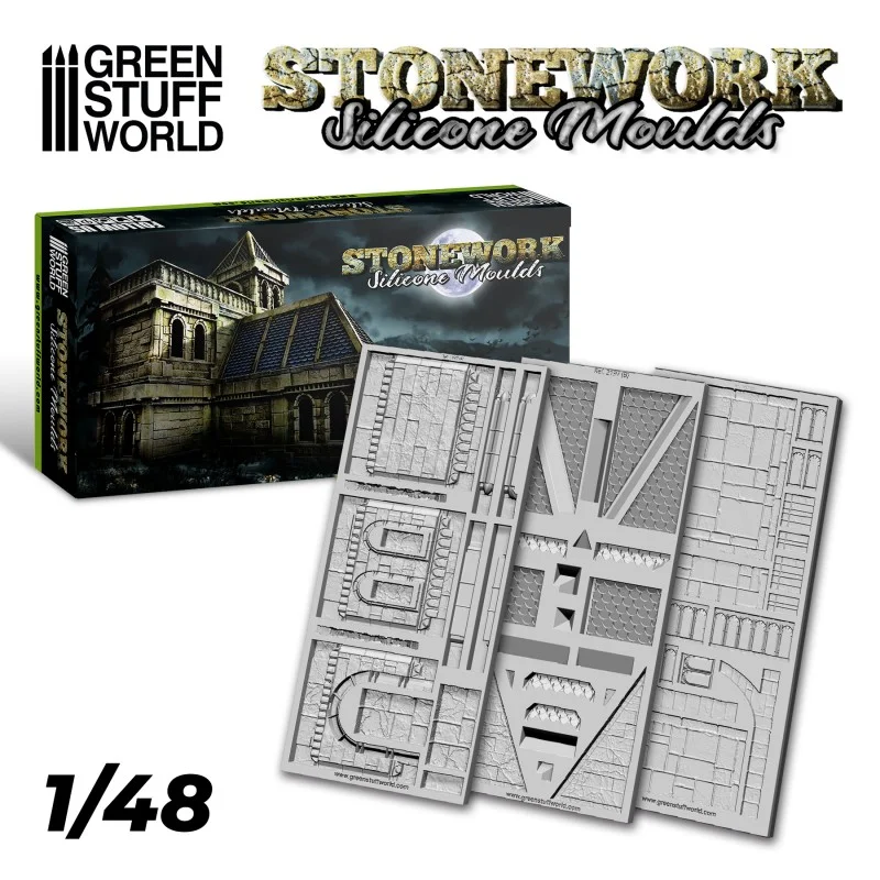 GSW introduces a revolutionary way of making scenery with these silicone moulds. Expertly designed these moulds allow you to produce infinite pieces of stone constructions. The parts have been very carefully designed to produce fully detailed pillars, walls, roofs, windows, archways and doors in a way that can be combined with each other flexibly without sacrificing architectural rigor. These moulds produce all the parts needed to build walls, castles, fortresses, monasteries, convents and anything you can think of with this type of architecture. Their versatility allows you to build anything from a single cottage to a huge bustling medieval city or a castle. All parts and their functions are carefully explained in the included instruction manual to help you in your designs. Compatible with acrylic resin (specially recommended), UV resins, polyurethane resin and epoxy resin. Scale 1:48 (wargames) Contains: 3x Silicone Moulds REMARKS: In the case of using acrylic resin, to avoid that the thinnest pieces can split during the demoulding phase, it is recommended to increase the % of acrylic resin to 50/50. Also, we remember that in cold environments the minimum drying times of acrylic resin increase to 1-2 hours depending on the temperature. Drying times may speed up in hot environments.