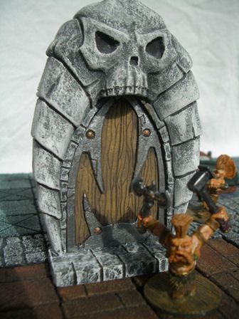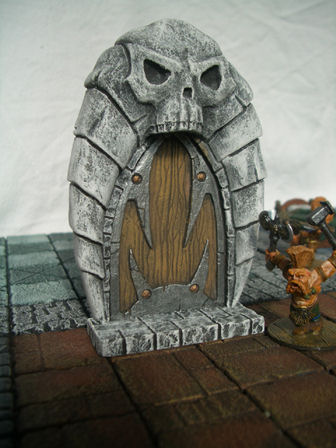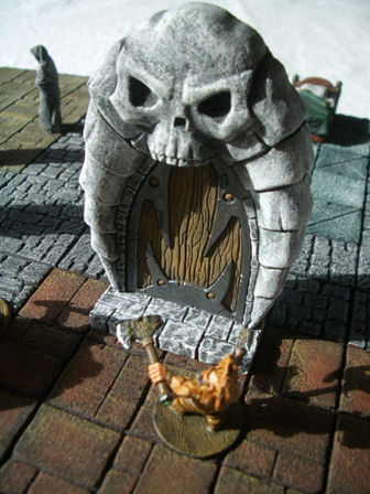 "The skull Portal is suitable in a dungeon, as well as a decoration in a building, room or a diorama. The portal is molded from high-quality resin and comes unpainted. The skull grimace and the solid metal-studded wooden door action is not really inviting. Nevertheless, there is no other way around it for the embattled dwarf to traverse around the door to find out what is behind it.