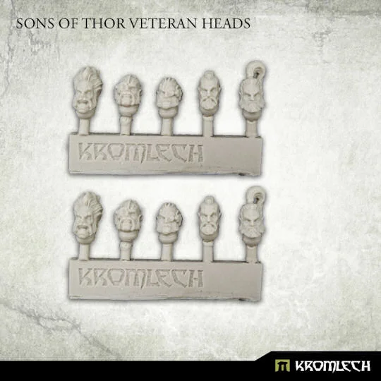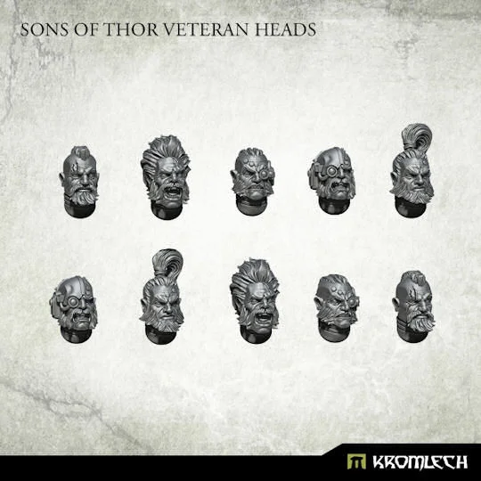 This set contains 10 high quality resin Sons of Thor Veteran Heads. Designed to fit futuristic 28mm heroic scale heavy armoured models. May require some assembly, supplied unpainted.