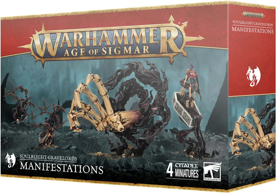 This multipart plastic kit builds four miniatures to represent three different Manifestations for your Soulblight Gravelords army in games of Warhammer Age of Sigmar. Summon macabre magic and watch as the Hand of Nagash reaches from a shadowy portal to crush your enemies. The Unholy Reliquary offers nearby heroes a pool of necromantic energy to heal and empower them, while the Sanguine Swarm creates two clouds of bats to leech the life of nearby foes.