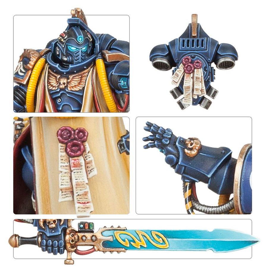 Symboliken är tydlig – bagghuvudet på hans högra shoulder pad och bältesspänne markerar hans tillhörighet till Librarius. Den vänstra shoulder paden är slät, vilket gör det enkelt att applicera valfri Chapter-symbolik.