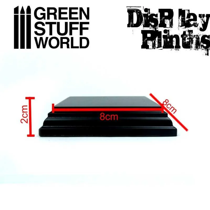 Square Top Display Plinth made of MDF wood coloured Black with a lacquered finish, ideal for exhibiting your figurines. The base comes with a soft green baize bottom. Measurements: 8x8 cm Height: 2 cm Base: 9.5x9.5 cm Colour: Lacquered Black Material: MDF Wood with baize bottom