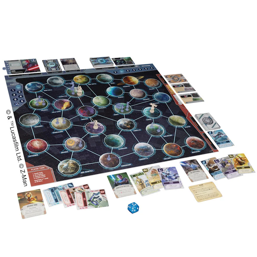 The next title in the bestselling Pandemic System, set in the Star Wars galaxy during the time of the popular The Clone Wars animated series. Players take on the roles of iconic Jedi heroes, each with unique and powerful abilities, to battle the Separatist forces. Includes four different scenarios, each with its own fan favorite villain. A large-sized game board featuring beautifully illustrated cards and striking miniatures including legendary Jedi, iconic villains, swarms of battle droids, and blockade ships make for a truly epic tabletop presence 50 Plastic Miniatures 1 Game Board 1 Die 138 Cards 4 Sheets 6 Plastic Markers 1 Plastic Slider 1 Rulebook