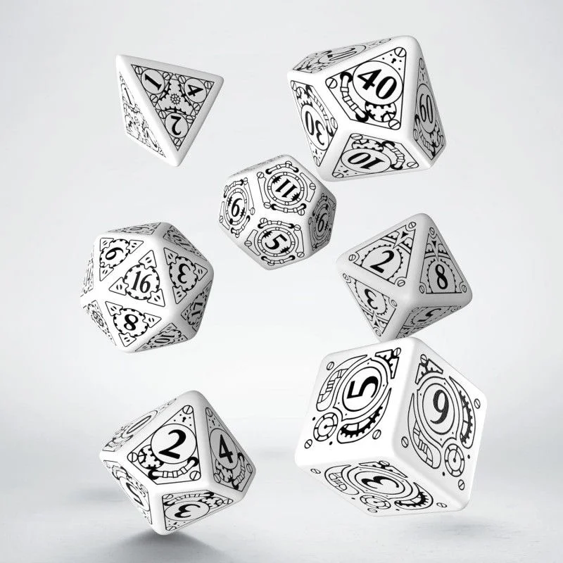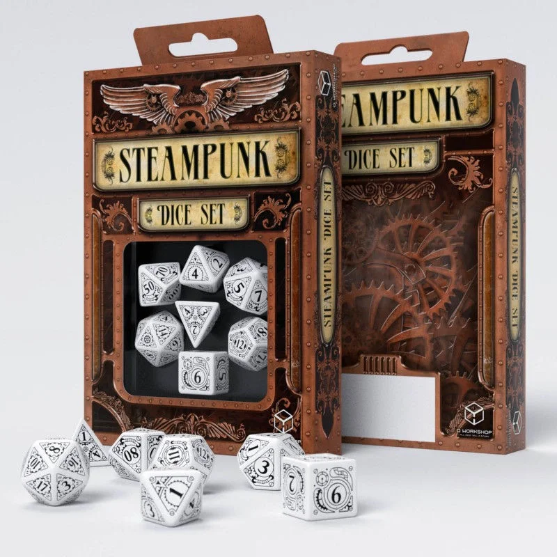 Steampunk is something more than cogs, wheels or the dames and gentlemen in fancy clothes. Its a whole another dimension of fandom, things, people, the entire aesthetics. Steampunk is like the dreams of Jules Verne come true and in style of the most sophisticated Victorian paragons. We in Q WORKSHOP value style, so we must design steampunk sets of dice in many wonderful colors. We have in mind the dice that shout: Full steam ahead! Bring me that horizon! These are sets for heroes in brass and copper wonders of retro-futuristic technology, that never was, but it should have been. To comply with these requirements, our dice are from best material and deeply engraved with festoons of cogs and clock mechanisms. We put our hearts in this project because the spirit of probably long dead romanticism is one of the ghosts that we will resurrect in his former glory, full of passion and joie de vivre. This spirit will be not trapped inside dice, but combined with secret ingredients, that we mix up in our casting vats. I can reveal to you, that we use the ground parts of one mad scientists machinery, that we bought at an auction in London.