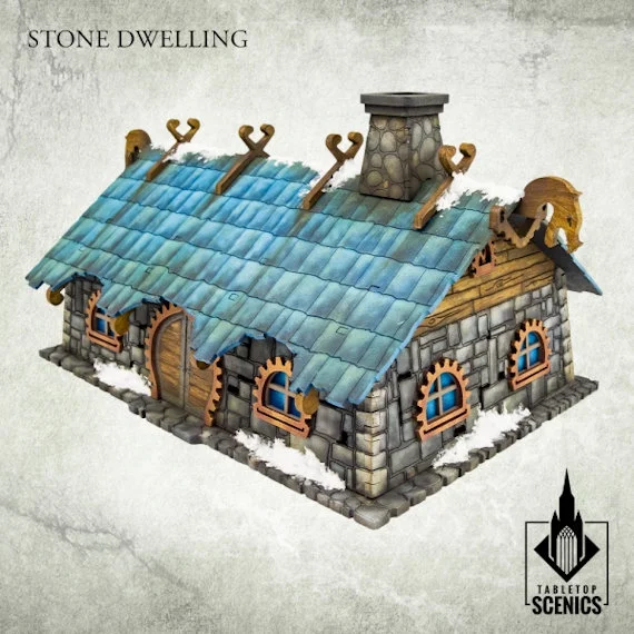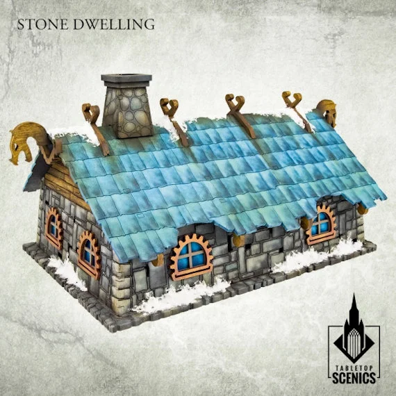 This set contains parts to assemble one Stone Dwelling - a common building in a dwarven village, which houses a family of a wealthier dwarven merchant, warrior or craftsman. Dimensions: Height: 4" / 10 cm Width: 9" / 23 cm Length: 5.5" / 14 cm