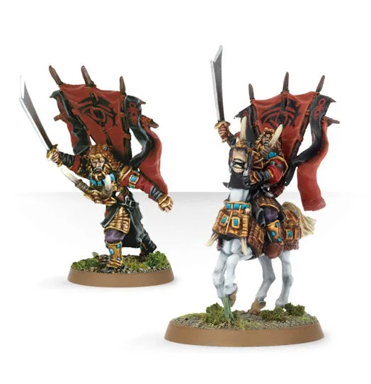 This pack contains 2 miniatures: Suladân the Serpent Lord on foot, and riding a horse. These models are resin cast miniatures supplied as eight separate components, and come with a 25mm round base and a 40mm round base. These miniatures are supplied unpainted and require assembly.