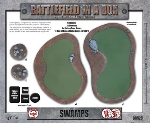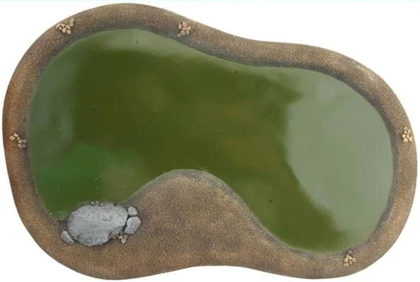 Swamps contain two pre-painted bog pool terrain pieces as well as four small stands of muck and rotten stumps. Included with the pre-painted swamps is a small bag of Green Static Grass allowing you can flock the shores of the marsh to match your battlefield. The pools are cast in a flexible material to withstand the rigors of gaming, while the stumps stands are made from durable resin.