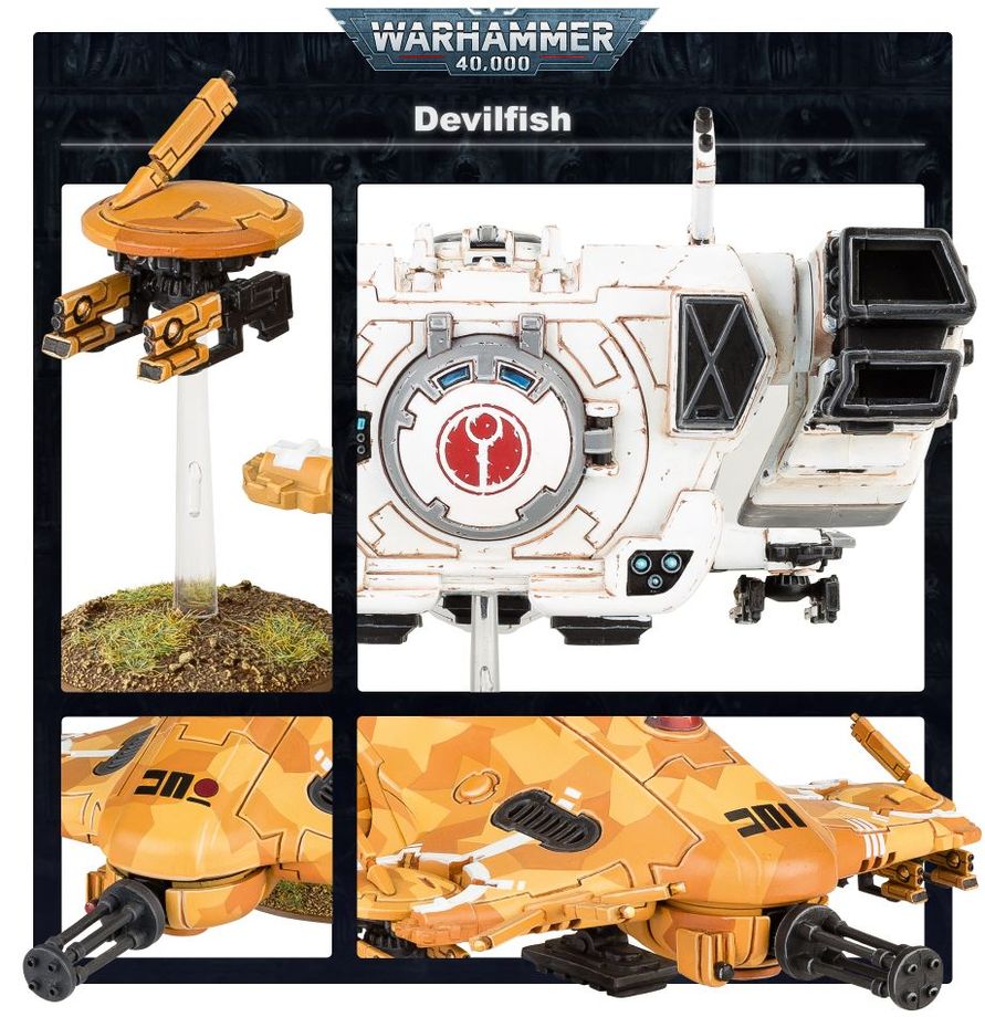 Devilfish är Fire Castes standardiserade pansartransport – ett robust och förvånansvärt rörligt fordon som använder antigrav-teknik för att sväva över svår terräng och snabbt landsätta infanterienheter i strid. När transporten nått effektivt stridsavstånd ger Devilfish ytterligare eldunderstöd med sin burst cannon samt sina skrovmonterade gun drones.