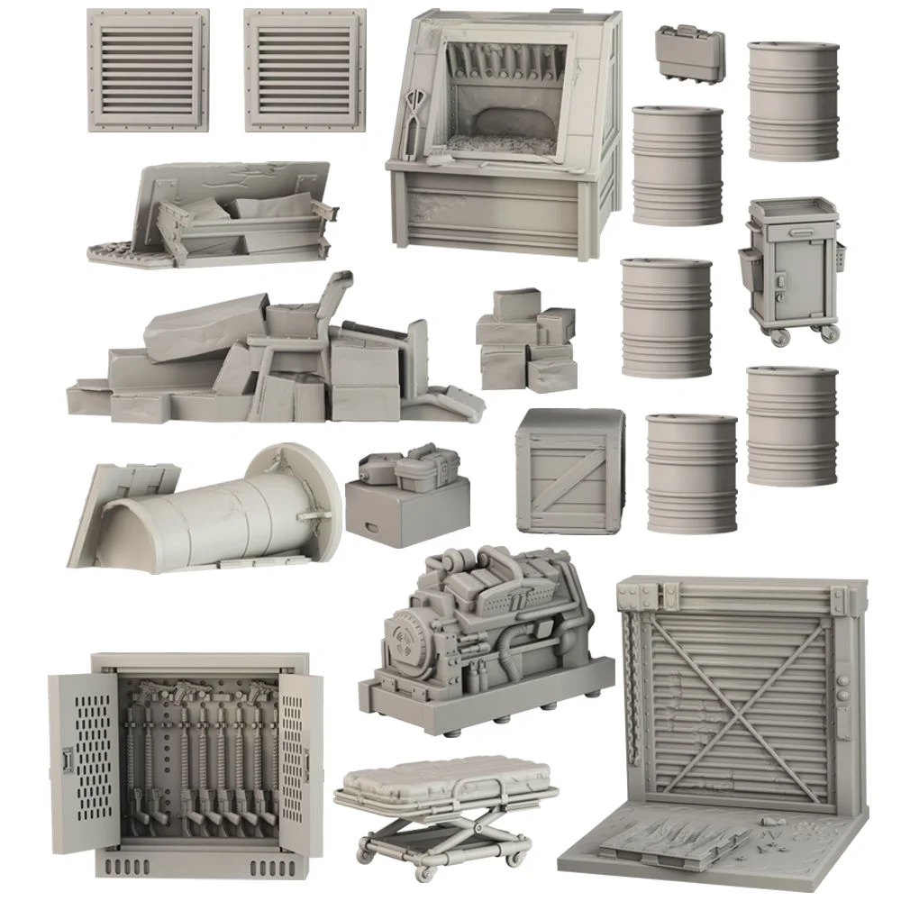 Warehouses are ideal sources of shelter and supplies after the world has ended. They can also play host to anything from clandestine corporate conspiracies to illegal arms trade and mafia deals. This set include a wide range of scenery to populate these grimy locales, even including a weapons locker and a furnace (for speedy disposal of evidence and competition). Contents: -20 pieces of plastic scenery