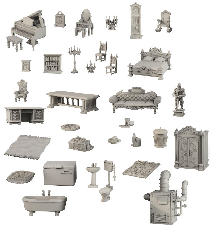 This set contains enough pieces to furnish a gothic manor. The scale is 28 - 30mm, making them perfect for many fantasy and historical games. The pieces are cast in high quality plastic and are preassembled, ready to play straight out of the box. Contents: 36 prebuilt plastic terrain pieces