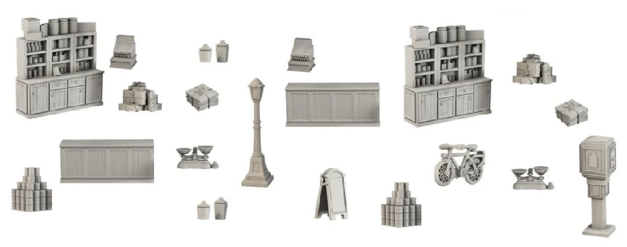 This set contains 20 pieces to furnish a table top shop setting. The scale is 28-30mm, making them perfect for many fantasy and historical games. The pieces are cast in high quality plastic and are preassembled, ready to play straight out of the box.