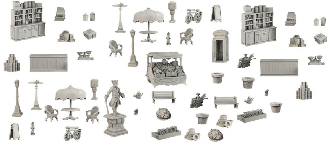 This set contains 64 pieces to furnish a table top town square setting. The scale is 28-30mm, making them perfect for many fantasy and historical games. The pieces are cast in high quality plastic and are preassembled, ready to play straight out of the box.