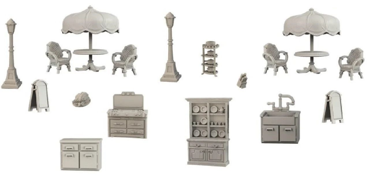 This set contains 20 pieces to furnish a table top shop setting. The scale is 28-30mm, making them perfect for many fantasy and historical games. The pieces are cast in high quality plastic and are preassembled, ready to play straight out of the box.