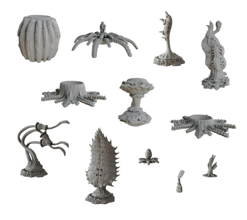 This set of modular trees have an alien jungle theme, but can easily be combined with other sets to create a visually stunning battlefield, for fantasy and sci - fi gaming alike. Modular parts have 5 mm holes for magnets (not supplied), for gamers that wish to recombine their trees for each game!