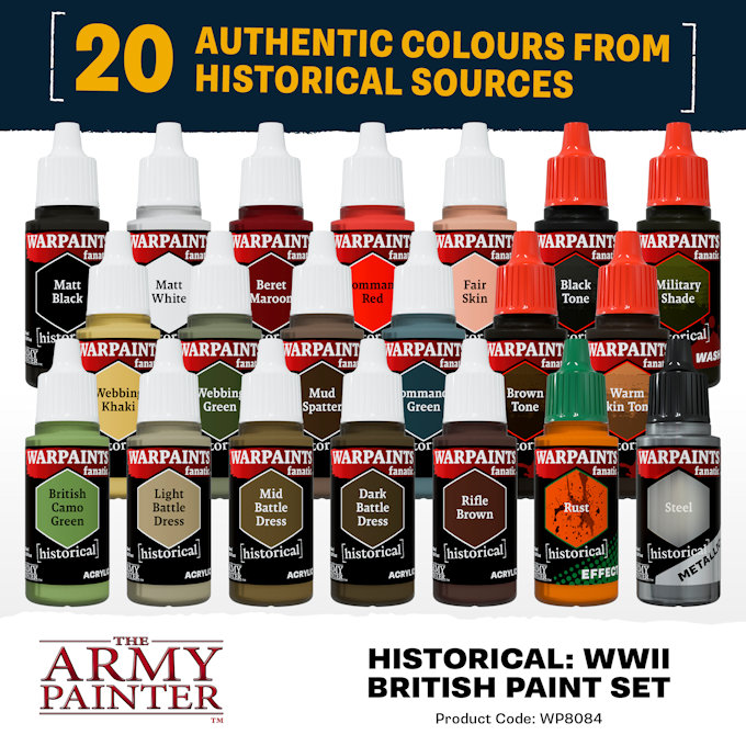 Stand Firm, Keep Calm, and Carry On! The British WWII set features eraspecific colours, selected with the help of expert historians, representing the resilient spirit of the British Armed Forces. Each Historical set blends the high-performance Warpaints Fanatic Acrylics,