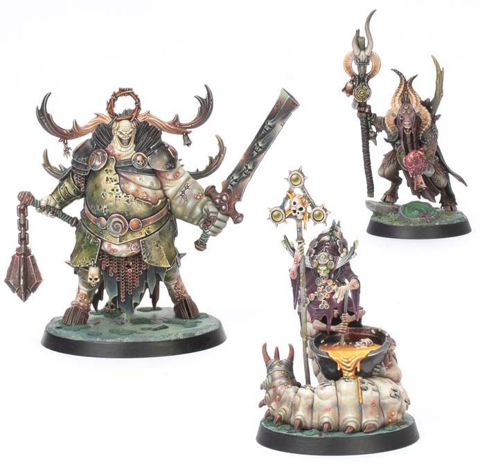 The Daemon Prince Gelgus Pust is a grotesque and monstrous creature whose corpulent body is riddled with parasites. Once a pious man, his ambition saw him fall into Nurgles clutches. He relishes despoiling the land, particularly the pure waters of Ghyran, where he makes his lair. He is often accompanied by Belga, a mortal who succumbed to the whispers of Nurgle and devolved into a maggot-bodied horror, her former sisters melded with her flesh. Foulhoof, a rancid shaman of vile renown regarded as a prophet by his bestial kind, completes the foul Daemon Princes court.