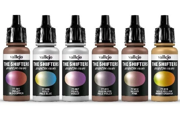 The sets in The Shifters range contain a selection of water-based acrylic airbrush metallic colors. Depending on the light or angle, color shifts from one shade to another to give a chameleon effect. Shake well, apply in thin layers. Best effects obtained over a gloss black base color.