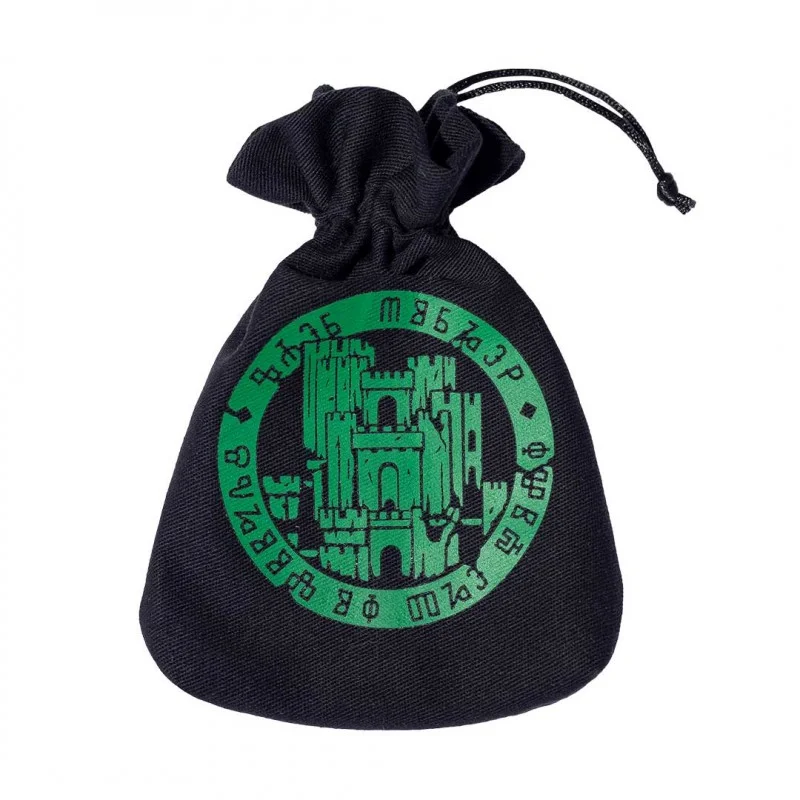 The School of the Wolf’s keep. This dice pouch, inspired by The Witcher franchise, depicts the ruins of Kaer Morhen, which was once a training ground for witchers from the School of the Wolf. It’s made of sturdy black cotton, which perfectly contrasts with the intensity of the green print. The pouch closes up tightly with the help of durable strings and can hold up to nine full sets — meaning ~63 dice!