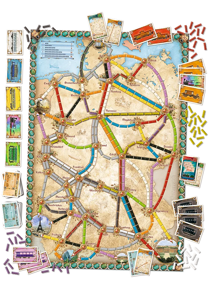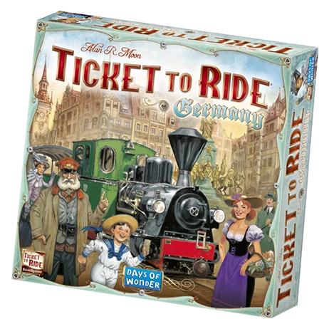 Turn of the century Germany... Through a fine autumn rain, a plume of smoke announces the arrival of the 4:15 train from Nuremberg in the Munich Central Station. The din of the massive engine grows more intense, culminating with a prolonged hiss as the locomotive halts at the platform, steam erupting in every direction. Already, porters in livery are rushing to unload baggage as passengers step from their cars. On the opposite platform, an operator pulls the cord for a three-chime whistle and another train begins chugging toward its next destination: Berlin, capital of the German empire. In Ticket to Ride Germany, build your own rail network to connect cities listed on your Destination Tickets. Watch out for your opponents who might be trying to reach the same far-flung corners of the German empire and outwit them by collecting valuable Passenger Meeples from the cities faster than they can. As with all installments in the Ticket to Ride series, this game can be learned in 5 minutes and provides hours of fun for families and experienced gamers alike. Hop on board! Ticket to Ride Germany is a complete, new game that does not require the original version and is guaranteed to offer you hours of enjoyment.