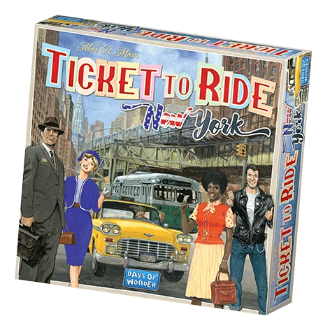 Welcome to the ’60s! Admire the stunning view from the Empire State Building, the world’s tallest skyscraper, or take a walk through the magnificent Central Park. Go from Times Square to Brooklyn to do some sightseeing… and enjoy! In this fast-paced Ticket to Ride game, players race one another through the busy streets of New York City to visit the most prestigious Tourist Attractions and complete their Destination Tickets. The elegantly simple Ticket to Ride gameplay appeals to both beginners and seasoned players. Learn the game in 3 minutes, play it for hours! Contains 1 board map of New York transportation network 60 plastic Taxis (15 in each color) 44 Transportation cards 18 Destination Ticket cards 1 rule leaflet 1 scorepad 1 pencil Game Information 2-4 Players Age 8+ 10-15 minutes