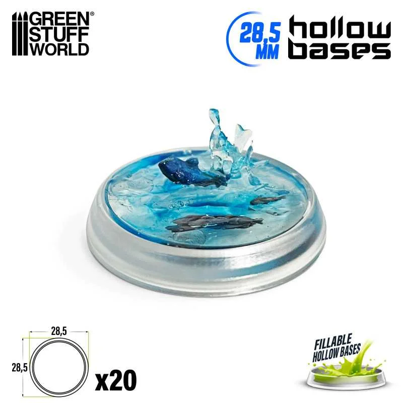 Plastic bases bevelled and hollowed out on the inside to create water or swamp effects, or even to sink minis and recreate the effect of being in the water or swamp. Compatible with any wargame or board game. Each pack contains 20x 28,5mm round transparent plastic bases.
