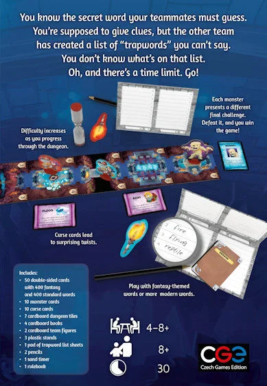Trapwords is a fun and fast-paced party game for two teams, who simultaneously prepare their lists of trapwords. The simple task of giving clues for your word is made fiendishly difficult by not knowing which words you can't say. If you succeed, you advance to higher levels with more trapwords and additional challenges. Includes a set of regular words as well as a set with a fantasy theme.