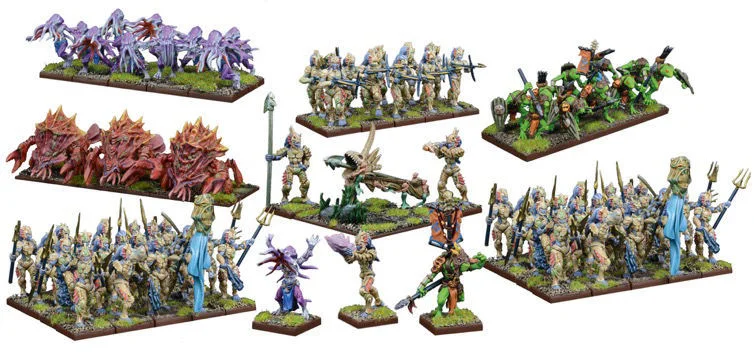 When the Trident Realms stir the very seas boil – storms rage, waves crash upon coastlines and the tides rise only to retreat, revealing the Neritican host, water cascading offshells and armour and ready for war. Contents: 50x Multi-part Hard Plastic Naiads with Weapons Options and Command 10x Multi-part Resin Thuul 10x Multi-part Metal Riverguard 3x Multi-part Metal Gigas 1x Multi-part Metal and Resin Leviathan’s Bane 1x Multi-part Resin Thuul Mythican 1x Multi-part Metal Riverguard Captain. Miniatures supplied unassembled and unpainted. Requires Superglue.