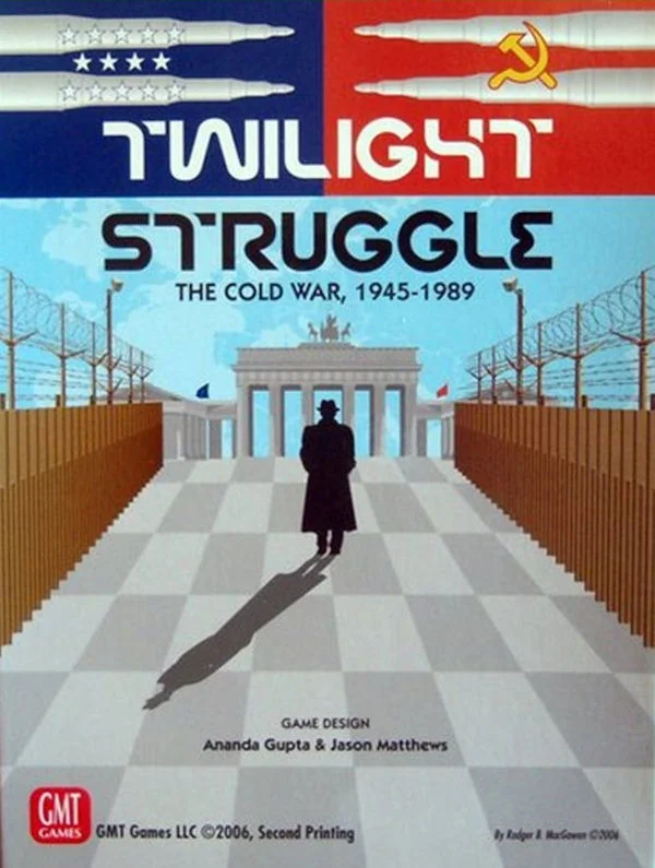 TWILIGHT STRUGGLE is my all-time favorite game. It is a brilliant first design by the team of Jason Matthews and Ananda Gupta. It takes the card-driven genre of games like WE THE PEOPLE, HANNIBAL; ROME VS. CARTHAGE, and WILDERNESS WAR to its highest peak. Every game is different and the game gets better and better as become more familiar with the individual cards. You are surprised as hidden combos are revealed game after game. Every turn is filled with tension as you try to figure out the best way to play the hand of cards you've been dealt. Gaming simply doesn't get any better than this. -Alan R. Moon "Now the trumpet summons us again, not as a call to bear arms, though arms we need; not as a call to battle, though embattled we are but a call to bear the burden of a long twilight struggle." John F. Kennedy In 1945, unlikely allies toppled Hitler's war machine, while humanity's most devastating weapons forced the Japanese Empire to its knees in a storm of fire. Where once there stood many great powers, there now stood only two the United States and the Soviet Union. The world had scant months to collectively sigh in relief before a new conflict threatened. Unlike the titanic struggles of the preceding decades, this conflict would be waged not primarily by soldiers and tanks, but by spies and politicians, scientists and intellectuals, artists and traitors. Twilight Struggle is a two-player game simulating the 45 year dance of intrigue, prestige, and occasional flares of warfare between the USSR and the USA. The entire world is the stage on which these two titans fight. The game begins amidst the ruins of Europe as the two new superpowers scramble over the wreckage of WWII and ends in 1989, when only the United States remained standing. Twilight Struggle inherits its fundamental systems from the card-driven classics We the People and Hannibal. It is a quick-playing, low-complexity game in that same tradition. The game map is a world map of the period, whereon players move units and exert influence in attempts to gain allies and control for their superpower. Twilight Struggle's Event cards add detail and flavor to the game. They cover a vast array of historical happenings: the Arab-Israeli conflicts, Vietnam, the peace movement, the Cuban Missile Crisis, and other such incidents that brought the world to the brink of nuclear annihilation. Subsystems capture the prestige-laden Space Race as well as nuclear tensions, with the possibility of game-ending nuclear war. Can you, as the U.S. President or Soviet Premier, lead your nation to victory? Play Twilight Struggle and find out. -------------------------------------------------------------------------------- Game Components COUNTERS 228 full color counters MAP One Deluxe 22"x34" full-color cardboard map CARDS 110 Event Cards OTHER Two six-sided dice 24-page Rule book 2 full color Player Aid cards -------------------------------------------------------------------------------- Game Features TIME SCALE approx. 3-5 years per turn MAP SCALE Point-to-point system UNIT SCALE Influence markers NUMBER OF PLAYERS 1 - 2