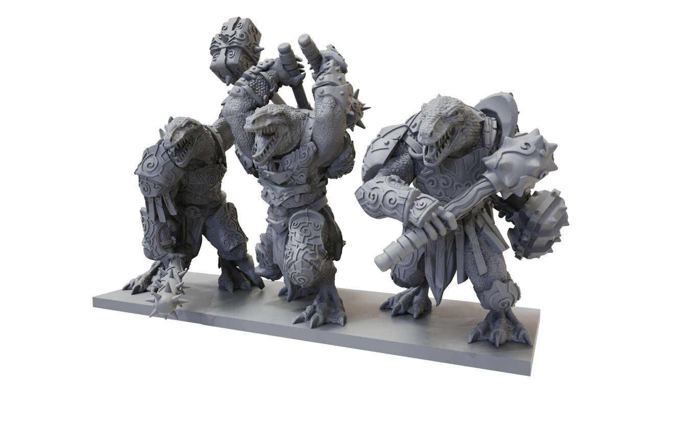 Tyrants are large, heavily muscled brutes that were nearly made extinct during the War with Winter. A bare few survived the great exodus but their numbers are steadily increasing to a point where they are confident accompanying the Salamanders to war. These ogre - sized warriors can smash the enemy's lines with a crushing, if unpredictable charge. Contents: 3x Resin Salamander Tyrants 3x Base