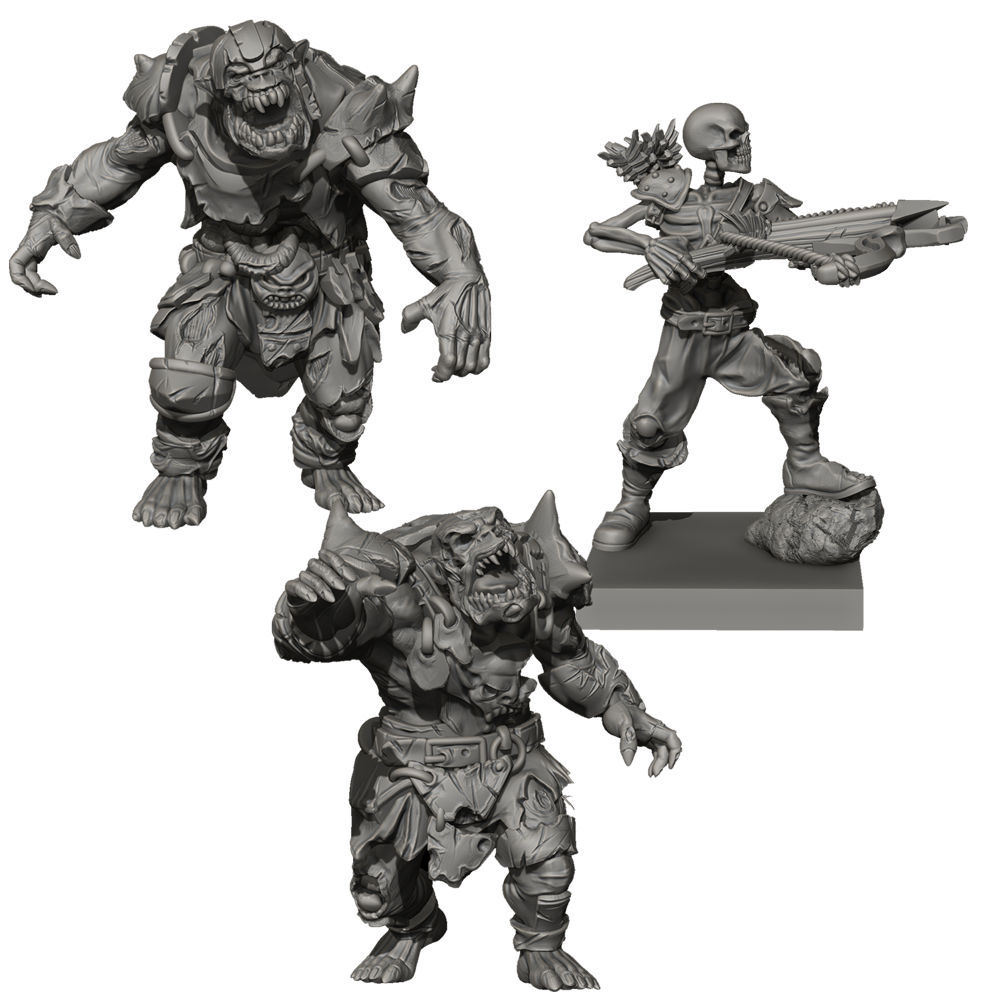 Although humans are the most commonly found race among the ranks of the undead, necromancers are able to raise the corpses of other species on the rare occasion. Orcs tough, muscled bodies make resilient undead warriors, while the animated bones of ancient elves retain their uncanny archery abilities. Contents: 2 Metal Armoured Zombie Orcs, 1 Metal Skeleton Archer/Crossbowman, and 4 Vanguard Cards. Supplied unassembled and unpainted.