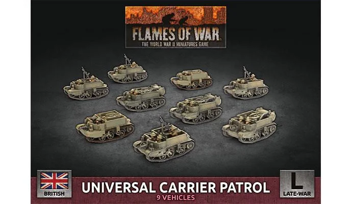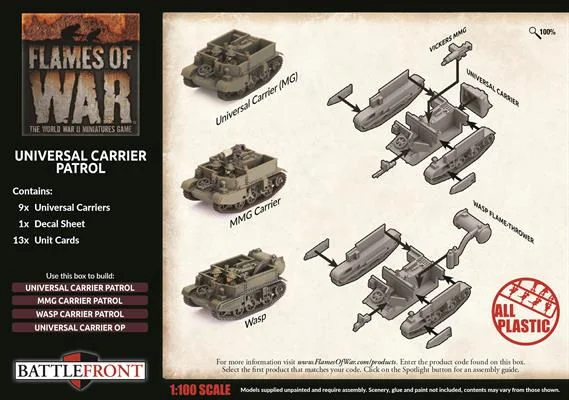 Contains: 9x Universal Carriers, 1x Decal Sheet and 13x Unit Cards. Use This Box To Build: Universal Carrier Patrol, MMG Carrier Patrol, Wasp Carrier Patrol, Universal Carrier OP