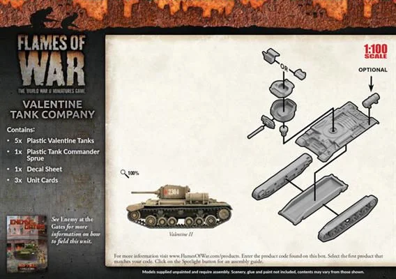 includes five plastic Valentine tanks, one plastic Tank Commander sprue, one Decal sheet and three Unit Cards.