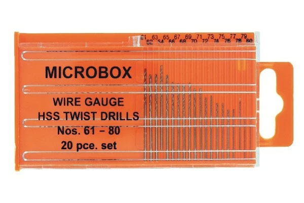 Set of 20 Drill Bits, Nº 61-80 Drill Set-wire gauge – sizes in U.S. inches Including sliding top index storage dispenser. Twenty high speed steel drill bits with handy slide-top box that releases only chosen drill bit. Drill numbers: 61, 62, 63, 64, 65, 66, 67, 68, 69, 70, 71, 72, 73, 74, 75, 76, 78,79, 80.