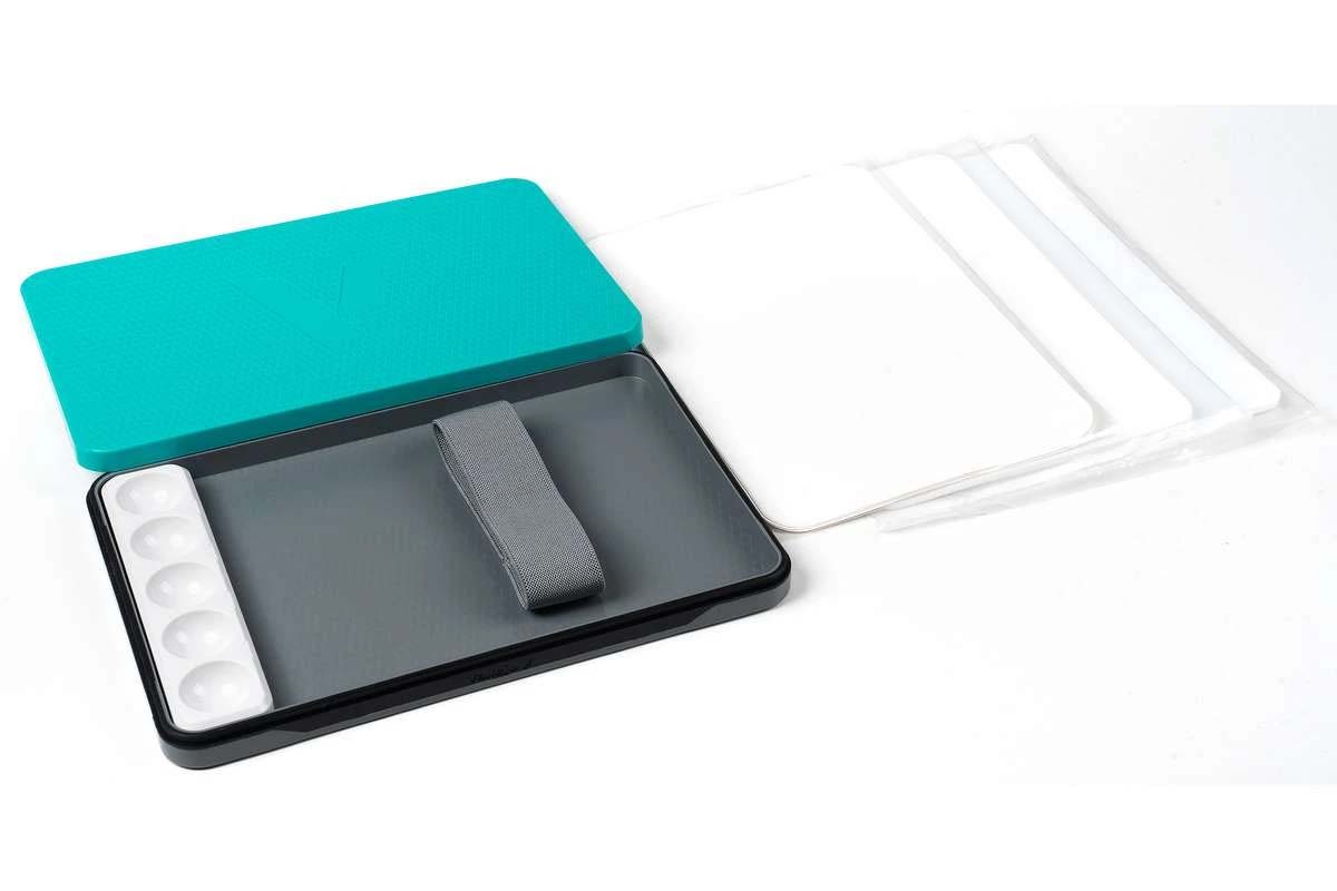 - 1 x Wet Palette 240x160 mm | 9.45x6.3 in: Made of high-strength ABS plastic. Rubber seal between case and lid provides excellent air tightness when closed. Case has non-slip rubber pads to ensure stability. The lid fits under the case to save space. The lid can also be used as a second palette. It has magnets on both sides to attach the Well Palette.