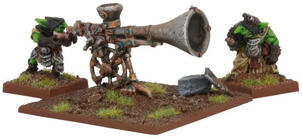 Certainly less reassuring than a sharpstick thrower because of its considerably more limited range, the war--trombones are still quite popular because these huge wheeled blunderbusses can unleash terrible destruction amongst the enemy. Goblin Warmachine 1 x Goblin War-trombone 2 x Metal Crew 1 x Base Models supplied unassembled and unpainted.