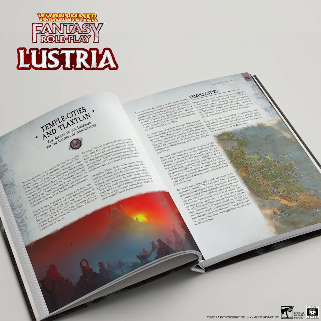 -Great new rules for explorer careers, founding and managing a settlement, Lizardmen of several different species, events and endeavours, parasitic diseases, monstrous creatures of the Lustrian jungle, and fully playable Skink Characters.
