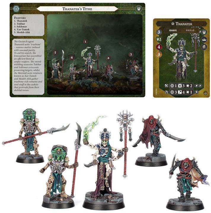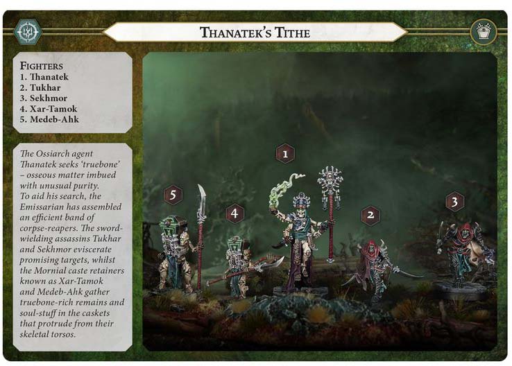 The Ossiarch agent Thanatek seeks ‘truebone’ – osseous matter imbued with unusual purity. To aid his search, the Emissarian has assembled an efficient band of corpse-reapers. The sword-wielding assassins Tukhar and Sekhmor eviscerate promising targets, while the Mornial caste retainers known as Xar-Tamok and Medeb-Ahk gather truebone-rich remains and soul-stuff in the caskets that protrude from their skeletal torsos.