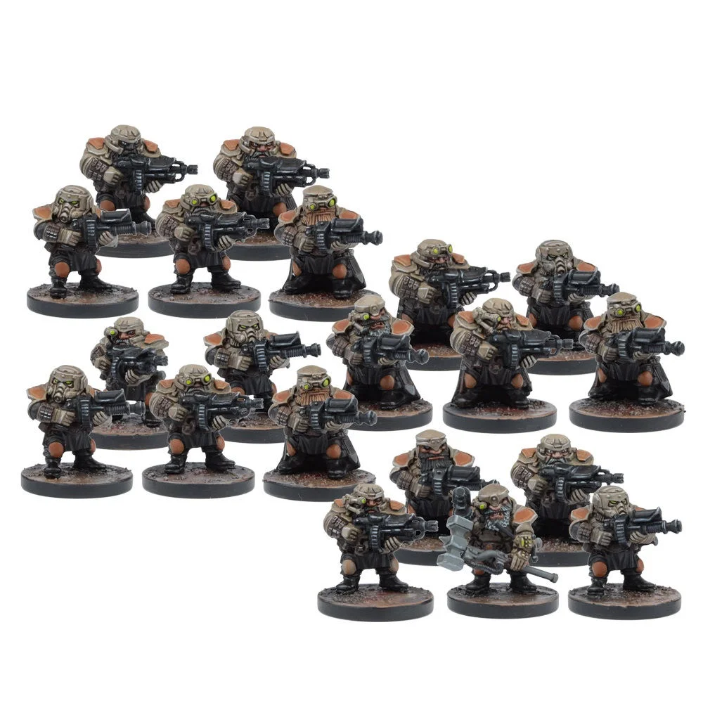 Contents: 20 Hard Plastic Militia with Commander and Weapon Options. Miniatures supplied unassembled and unpainted."
