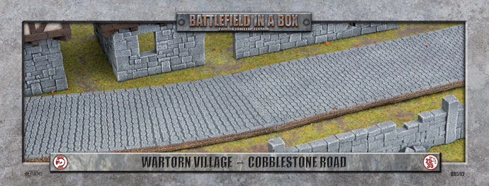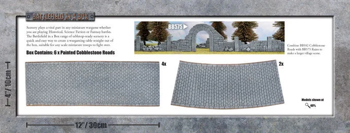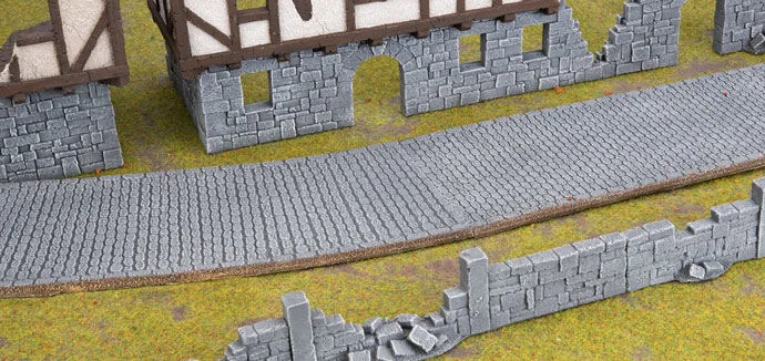 The Wartorn Village - Cobblestone Roads is provided prepainted. Miniatures, scenery, glue and paint not included.