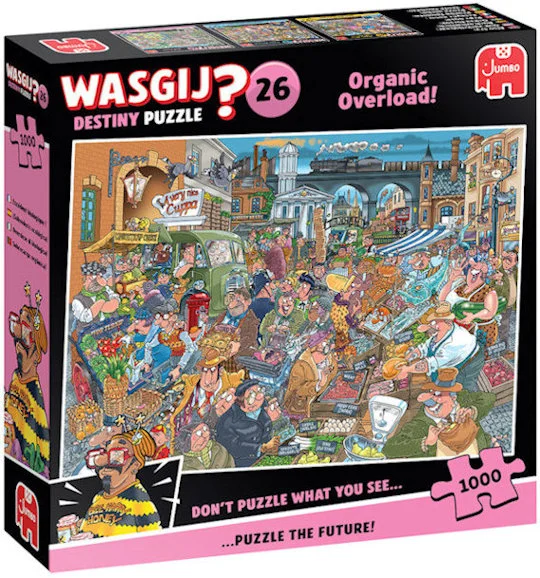 Introducing Wasgij Destiny 26, Organic Overload, 1000 Piece Jigsaw Puzzle. Step into the intriguing world of Wasgij Destiny 26, a unique addition to your jigsaw puzzle collection. This brainteaser challenges you to piece together the future rather than the present scene shown on the box. Experience the vibrant hustle and bustle of a lively street market as it transforms over time. How has today’s market square evolved? Use your imagination and the provided clues to puzzle out the future scene and discover the changes. Wasgij puzzles are designed to stretch your creativity and enhance your problem - solving skills. This puzzle is perfect for enthusiasts looking to elevate their puzzling experience, making it an ideal gift for those who enjoy a good mental challenge. Constructed from sustainable and durable 100% recycled cardboard, this 1000 - piece jigsaw puzzle is both environmentally friendly and highly entertaining. Precision die - cutting ensures that every piece fits together perfectly, retaining its shape and quality. Embrace the unique challenge of Wasgij puzzles, where the image on the box is just the beginning. Use your creativity and the clues provided to uncover the future scene you're puzzling. Enjoy the satisfaction and fun of solving this distinctive puzzle concept.
