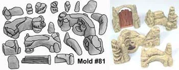 This mold will create 4 water cavern wall sections shown. It includes an archway half and wooden door half. En av många fantastiska gjutformar för gips avsedda för 28 mm skala modellbygge eller figurspel. Passar utmärkt som terräng för tex Warhammer, 40K, Confrontation, Necromunda, Mordheim, WWII-spel mfl. Gjutformarna är av högkvalitativt silikongummi, gjort för många års användande och räcker till hundratals avgjutningar. Hirst Arts blocksystem är mycket flexibelt och formarna kan användas utmärkt tillsammans för att skapa allt inom fantasins gränser. För bygginstruktioner och tips, besök www.hirstarts.com''