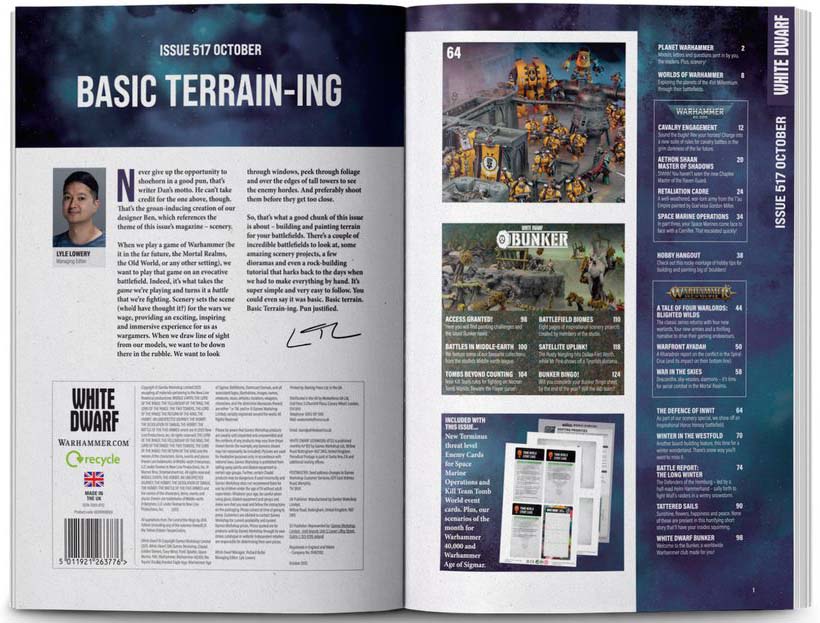 Each copy of White Dwarf 517 also comes with a cardboard insert containing the scenarios of the month for Warhammer 40,000 and Warhammer Age of Sigmar, Terminus threat Level Enemy cards for the Space Marine Operations mini-game, and Kill Team: Tomb World event cards are also included.