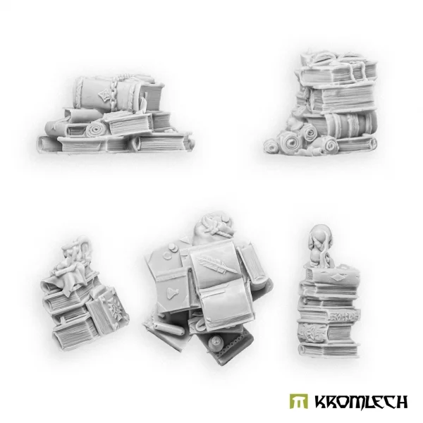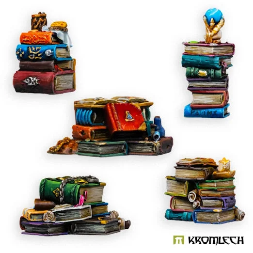 Ancient grimoires, forgotten manuscripts and works of hundreds wizards and witches from all over the world. The knowledge contained within them is as much dangerous as the books themselves - scattered across the floor and piling up to the ceiling. Careless person can easily trip over them or cause an avalanche of all those heavy tomes. This set contains five high quality resin model of Wizard's Bookpiles. Designed to fit 28mm heroic scale wargames. Supplied unpainted and may require assembly.