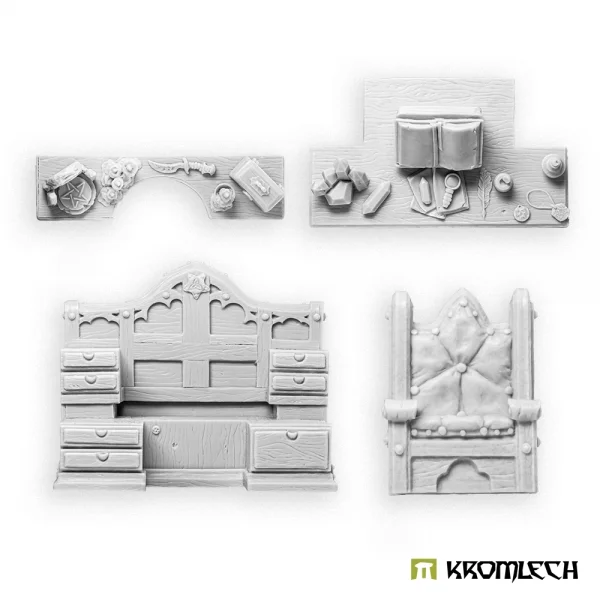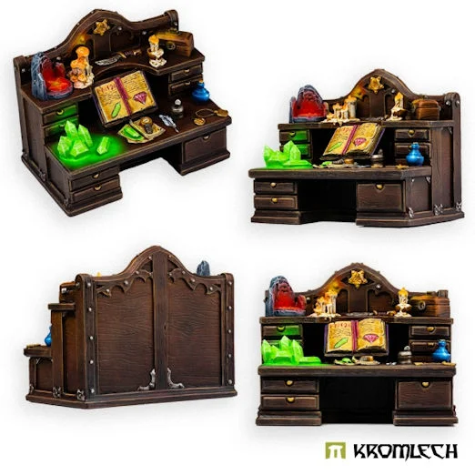 Broad desk with tons of books, accessories and various trinkets, along with a comfortable chair -the most important place in every wizard's workshop. This is where the magic happens. Literally! This set contains high quality resin models of Wizard's Desk along with a chair. Designed to fit 28mm heroic scale wargames. Supplied unpainted and require assembly.