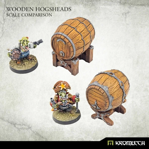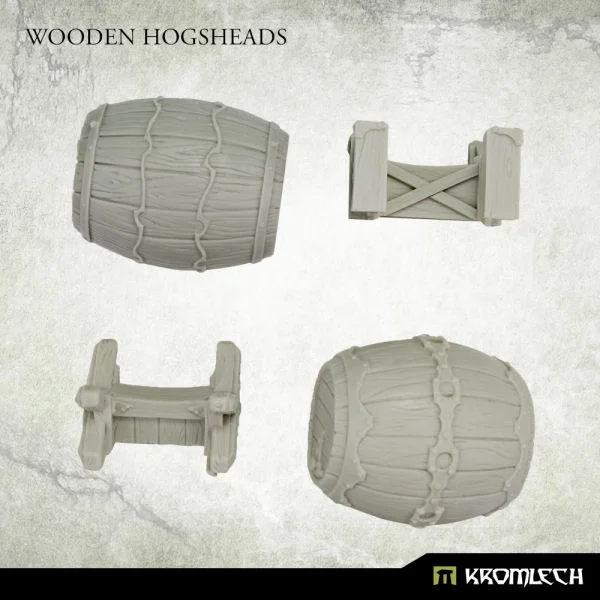 This set contains 4 high quality resin parts needed to assemble 2 Wooden Hogsheads with their stands designed to fit fantasy 28mm heroic scale. Please note that models seen on pictures are not part of this set.