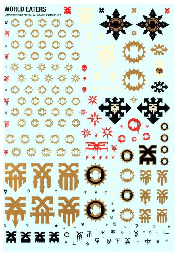 World Eaters transfer-karta med 200 dekaler med Khornesymboler, runor, åttaspetsiga stjärnor, dödskallar och variationer av World Eaters Legionens ikon