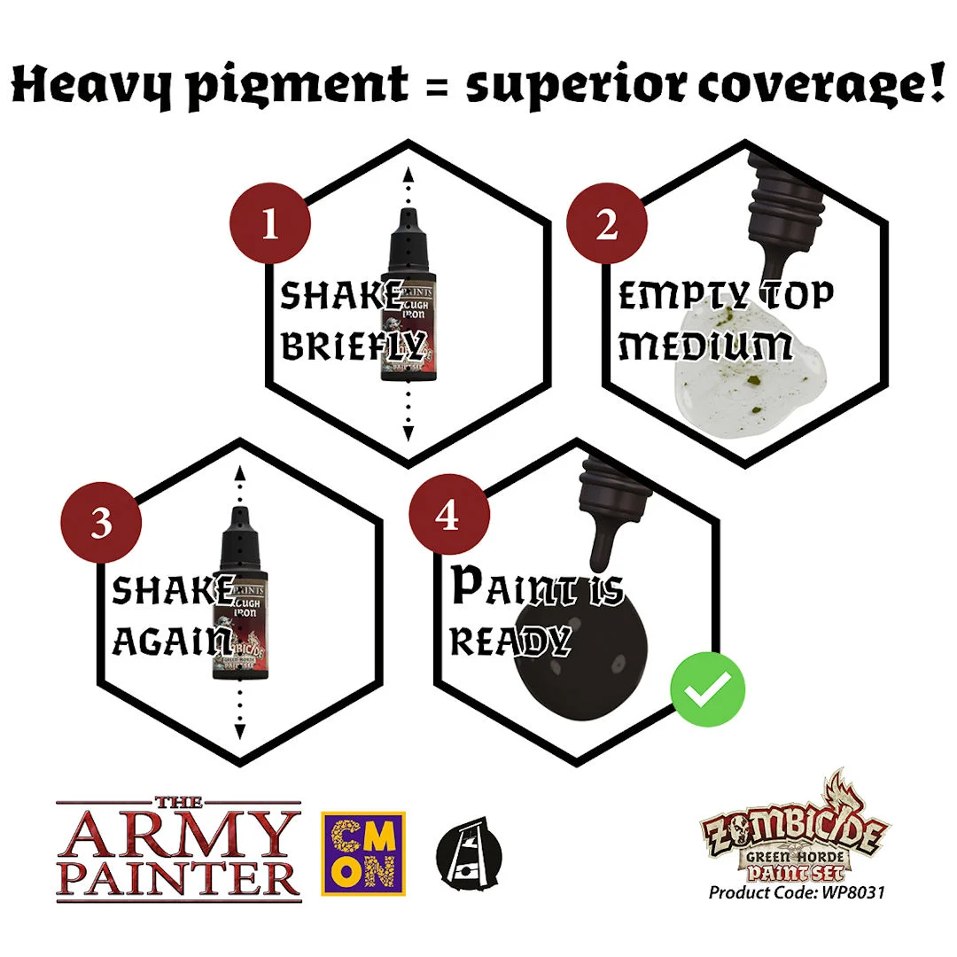 Zombicide: Green Horde is the cooperative miniature board game from CMoN and comes packed with undead greenskins and mighty survivors. This official Zombicide paint set expansion comes with 6 Warpaints, designed to paint the undead hordes of Orcs, Goblins and evil Necromancers. The Green Horde paint set is an expansion to the 10 paints in the Zombicide: Black Plague paint set and will allow players and painters the full capacity to paint medieval fantasy zombies of all kinds as well as the brave hero survivors set out to battle the evil. Zombicide Green Horde paint set contains the following six 18ml dropper bottled Warpaints: -Ork Skin -Goblin Skin -Crushed Skull -Pale Flesh -Rough Iron (metallic) -Horde Shader (wash)
