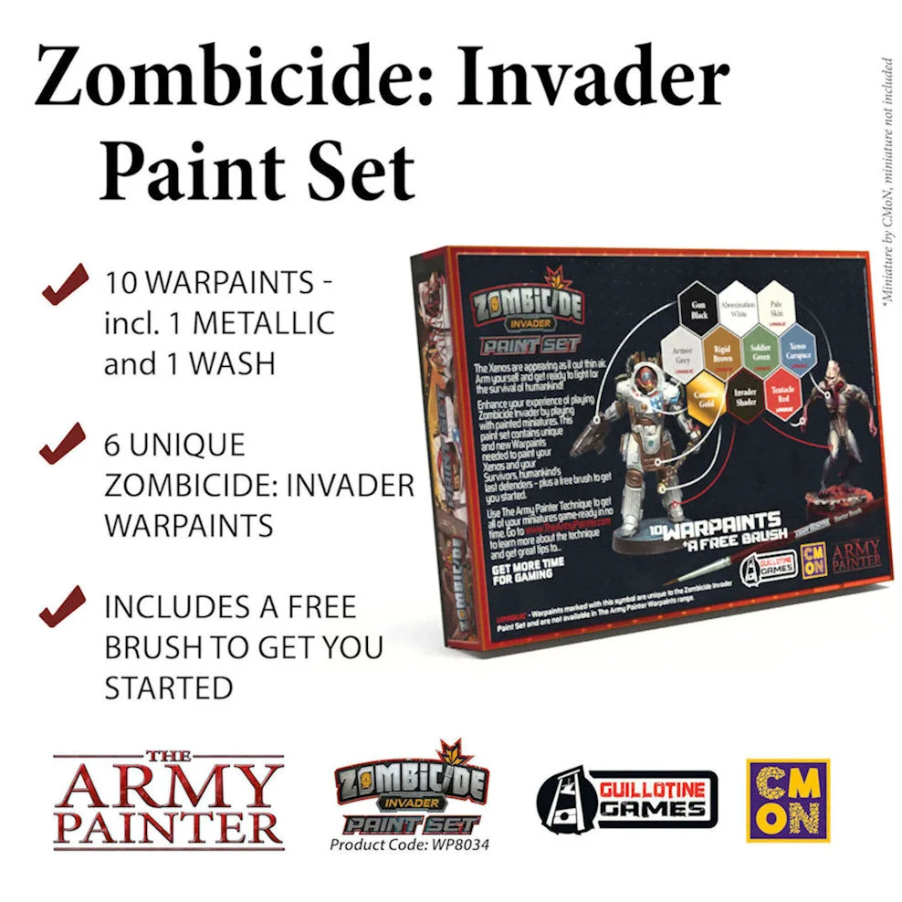 The Xenos are appearing as if out of air. Arm yourself and get ready to fight for the survival of humankind! Enhance your experience of playing Zombicide: Invader by playing with painted miniatures. This paint set contains unique and new Warpaints needed to paint your Xenos and your Survivors, humankind's last defenders - plus a free brush to get you started. THE NEW PAINT SET OFFERS: -10 x Warpaints -6 of them unique to Zombicide: Invader -A starter brush